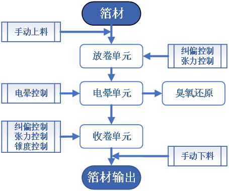 產(chǎn)品簡介: 由收放卷單元、電暈單元、臭氧還原單元、糾偏張力單元及控制單元等組成。