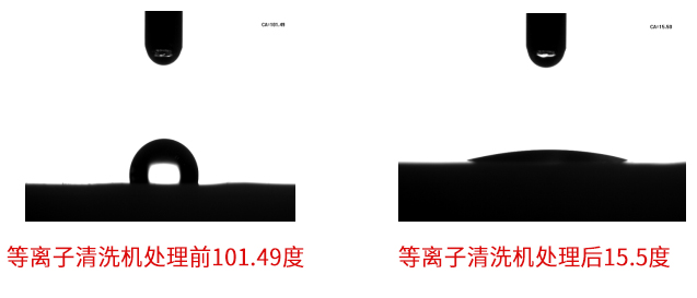 上面是陶瓷填充PTFE聚四氟乙烯薄膜等離子處理前后的水滴角對比